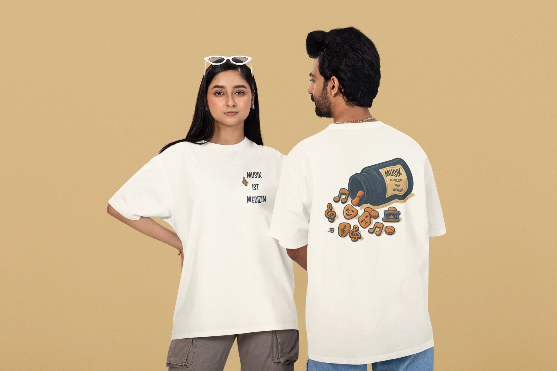 Dieses oversized Shirt vereint Style mit einer klaren Botschaft. Vorne auf der Brust steht schlicht: „Musik ist Medizin“ – und auf dem Rücken entfaltet sich das volle Design: eine transparente Pillenflasche voller musikalischer Symbole und der Aufschrift „Musik – rezeptfrei, aber wirksam“.